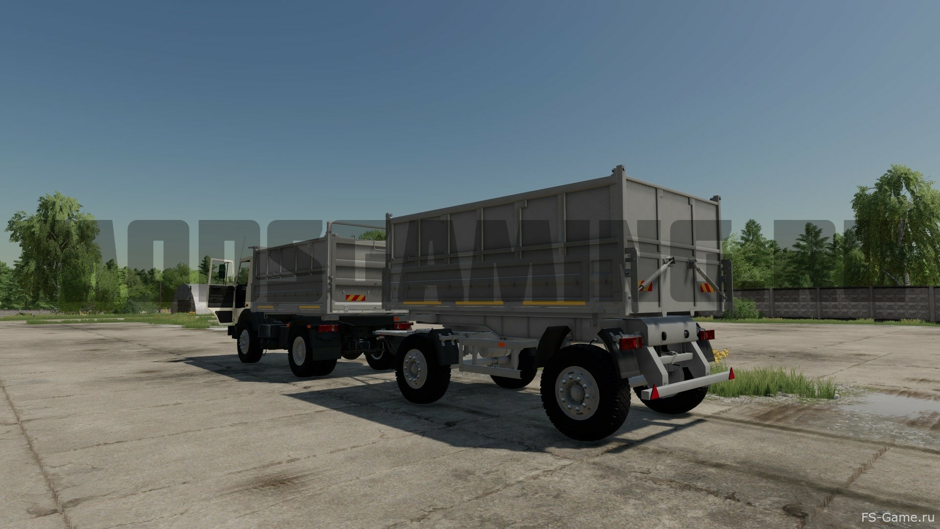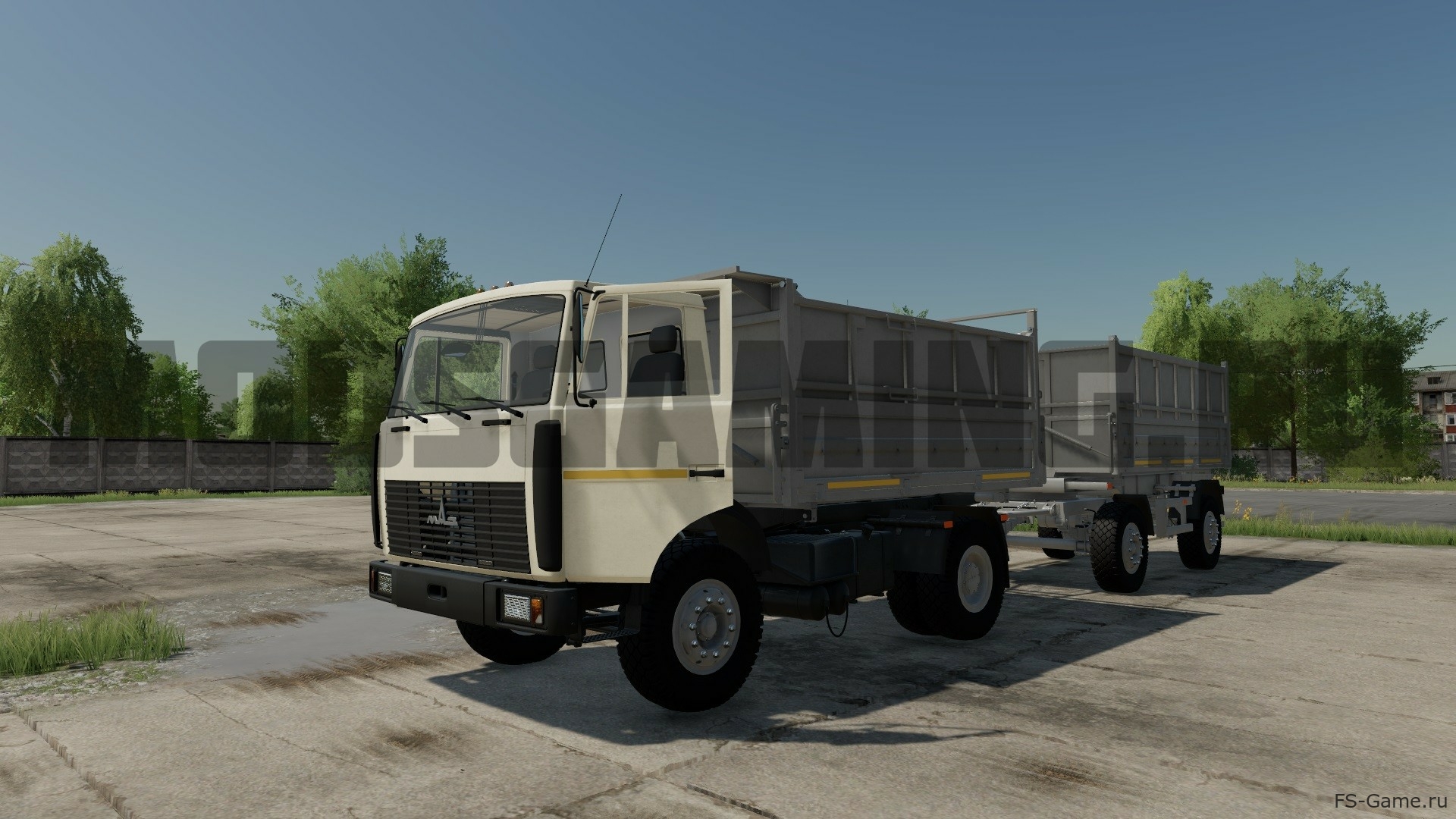 В мод входит: МАЗ-5551 A2: - Мощность: 177 кВт / 240 л.с.; - Скорость: 85 км/ч; - Объем топливного бака: 200 л.; - Стоимость: 19 500 €; - Выбор основного цвета; - Выбор цвета дизайна; - Выбор цвета обода; - Конфигурация кузова; - Конфигурация глушителя; - Конфигурация габаритных огней; - Конфигурация колес; - Конфигурация номерного знака; - Регулируемые зеркала; - Ремни фиксации; - Динамические шланги; - Рабочая светотехника; - Рабочие зеркала; - Анимированная приборная панель, педали, рычаг КПП, подвеска, брызговики; - Оставляет следы; - Пачкается и моется; - Эффект старения; - Объем кузова: 12 500 / 14 500 л; - Поддержка скрипта "Simple IC". Прицеп МАЗ-8571N: - Стоимость: 9 500 €; - Выбор основного цвета; - Выбор цвета дизайна; - Выбор цвета обода; - Конфигурация кузова; - Конфигурация габаритных огней; - Конфигурация колес; - Конфигурация номерного знака; - Анимированная подвеска, брызговики; - Динамические шланги; - Рабочая светотехника; - Оставляет следы; - Пачкается и моется; - Эффект старения; - Объем: 14 500 / 16 500 л.